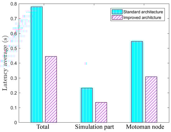Figure 7 and Table 2 show an improvement of overall latency. The latter average is equal to 0.445 s, which corresponds to a relative improvement of 42.94% with respect to the standard control. Such latency is acceptable (Between 0.4 s and 0.5 s) for precise teleoperation tasks [18]. The latency average of the updated simulation part is equal to 0.136 s, which corresponds to a relative improvement of 41.37% with respect to the standard control. Additionally, the modified Motoman node leads to a latency of 0.309 s, which represents a relative improvement of 43.61% with respect to the standard control. As seen in Figure 8, the proposed control architecture, based on velocity control, improves the real-time robot response in terms of latency reduction.