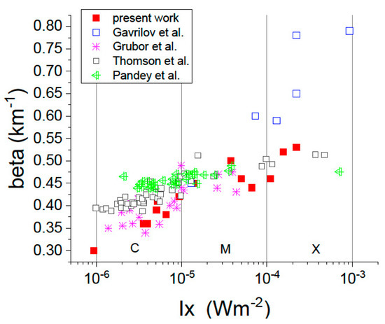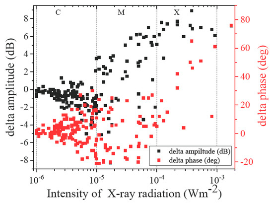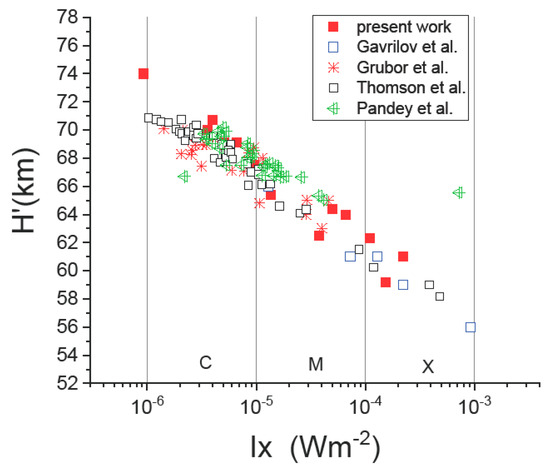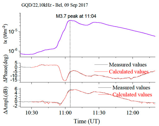- Thomson, N.R.; Rodger, C.J.; Clilverd, M.A. Large solar flares and their ionospheric D region enhancements. J. Geophys. Res. 2005, 110, A6. [Google Scholar] [CrossRef] [Green Version]