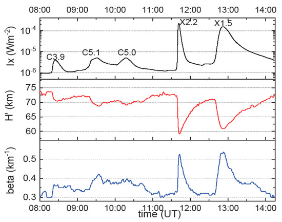 - Grubor, D.; Šulić, D.; Žigman, V. Classification of X-ray solar flares regarding their effects on the lower ionosphere electron density profile. Ann. Geophys. 2008, 26, 1731–1740. [Google Scholar] [CrossRef] [Green Version]