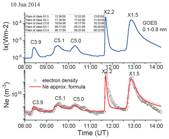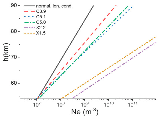 - Nina, A.; Čadež, V.; Srećković, V.; Šulić, D. Altitude distribution of electron concentration in ionospheric D-region in presence of time-varying solar radiation flux. Nucl. Instrum. Methods Phys. Res. B 2012, 279, 110–113. [Google Scholar] [CrossRef] [Green Version]