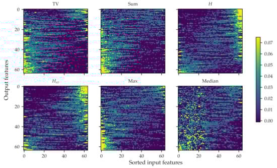Figure 6, each matrix with its features (rows) sorted top to bottom from lowest to highest orness value. These figures show how different ordering metrics tend to converge to different learned features, with different preference for