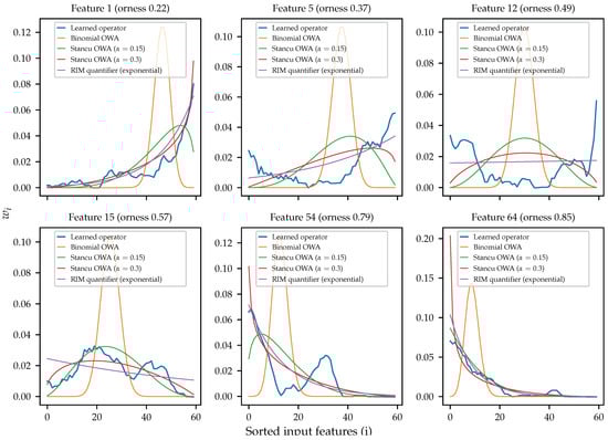 We can observe how the simpler examples (Features 1 and 64 in the figure) are monotonic and behave very similarly to the Stancu OWA operator and the exponential RIM operator. In the case of Feature 1, with orness , the learned operator is best approximated by the Stancu OWA with , while for the Feature 64, with orness , the best approximation would be the Stancu OWA with . In any case, they can be properly generalized by the Stancu OWA. In both cases, the exponential RIM operator seems to give a very good approximation without the need of any parameter adjustment (it only varies according to orness).