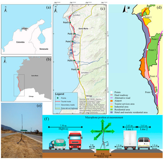 General global position of the study area (a), zoomed-in image of the study area (b), map of the main road studied and major junctions (c), map of the road and surrounding land use (d), photograph of the monitoring campaign at point 5 (e), and diagram of a transverse section at a sampling point (f).