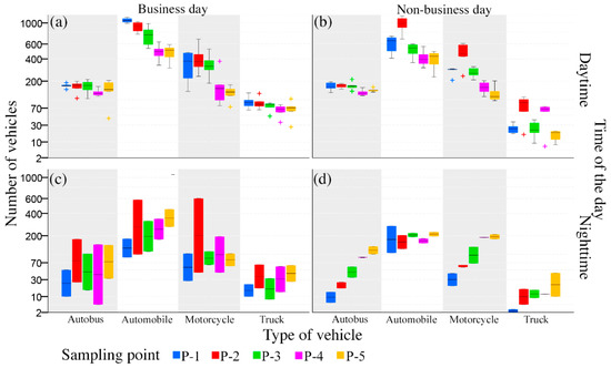 The variation in the number of vehicles was influenced by the time of day (ANOVA p-value 0.000) and the sampling points (p-value 0.003). Additionally, when discriminating by vehicle type, the day of the week also influenced the variation of the quantity of vehicles (p-value 0.000 in all types). If the results were tested by the sampling points, a significant influence was observed for automobiles (p-value 0.000) and motorcycles (p-value 0.000). In addition, the test considering the day of the week produced significant results for trucks (p-value 0.000) and automobiles (p-value 0.042). More details are in Supplementary Materials Table S4.