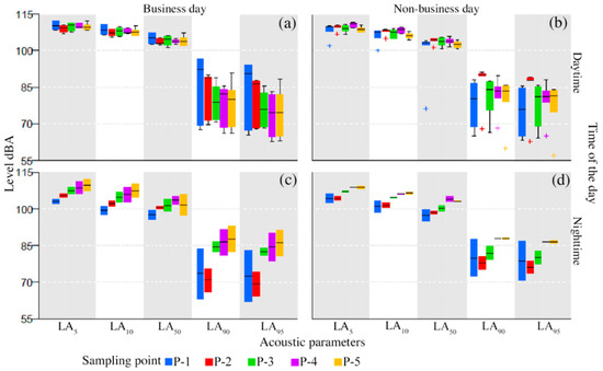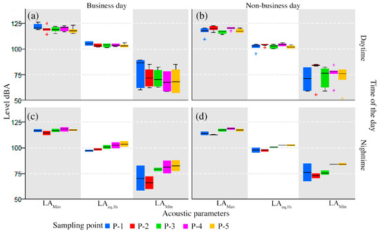 LA50 exhibited similar results to those of LAeq but with a slight increase (Figure 5). The same behavior was exhibited for the time of day and day of the week but with even greater variation. The background noise exhibited substantial variation between the different times of the day, with higher values recorded during the day than at night, especially at sampling points 1 and 2. This was similar to the day of the week variable, with higher values recorded on weekdays than on weekends and sampling points 1 and 5 exhibiting a greater difference (Figure 5). Finally, the peak values exhibited the least variation between the experimental design variables (time of the day and day of the week). However, the behavior was similar to that of LAeq or LA50, excluding the records taken at sampling point 5 during the night and sampling points 2 and 4 on weekends (Figure 5). More detail about the data is available in Table S3 in Supplementary Materials.
