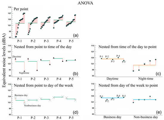 ANOVA graphs for the equivalent noise level with different nested sampling factors (P. sampling point). (a) The environmental noise ANOVA test. (b) ANOVA nested from sampling points to time of the day for noise level values. (c) ANOVA nested from the time of day to sampling points for noise level values. (d) ANOVA nested from sampling points to the day of the week for noise level values. (e) ANOVA nested from the day of the week to sampling points for noise level values. The hourly mean of LAeq is represented by ■, ▲ represents the mean of LAeq per time of the day, ● represents the mean of LAeq per sampling point, and ✕ represents the mean of LAeq per type of day of the week. The green line is the mean of LAeq. The orange line is the mean of five sampling points for day or night. The blue line is the mean of five sampling points for each type of day.