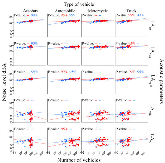 The ANOVA test confirmed that the mean noise level was similar at all sample points; however, the traffic flow was not. Therefore, the sampling points and reported noise levels did not show a relationship with the traffic flow. However, the ANOVA test exhibited homogeneity between buses and trucks, thereby confirming a relationship between these vehicle categories and the equivalent continuous noise. This was confirmed by the Pearson test, with a direct relationship between LAeq and the buses or trucks. The present results are similar to those of other national studies in Bogota and Tunja, Colombia, which observed a correlation between LAeq and automobiles, buses, and trucks [34,52], and international studies conducted in Belgium, which observed a relationship between trucks and the noise level [58].