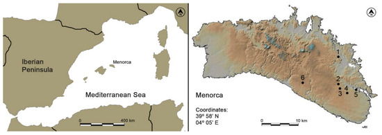 Localities in Menorca cited in the text. (1) Es Capell de Ferro (Mahon); (2) Algendaret Nou (Mahon); (3) Talatí de Dalt (Mahon), (4) Cornia Nou (Mahon); (5) Museum of Menorca (Mahon); (6) Torre d’en Galmés (Alaior).