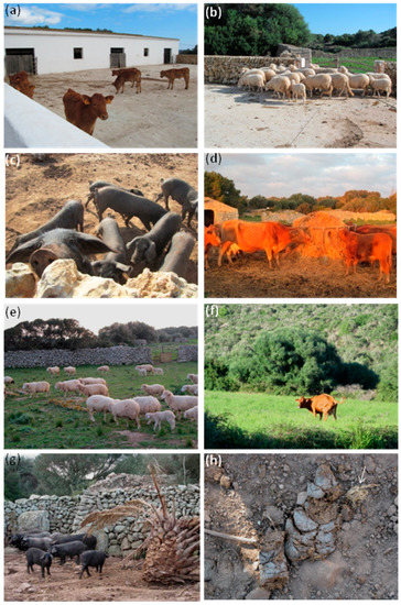 At present, cattle and dairy farming in particular play a key role in the island, with a production characteristic of the Western Mediterranean region, traditionally dry land in winter and with a use based on grazing [42]. The Balearic Islands have a total of 213 dairy farms, with an annual quota of 84 million kilos of milk (2011 data in [42]). Most of these farms are located in Menorca, which represents around 73% of the total milk production of the islands, intended mainly for the production of cheese of the Mahon-Menorca protected designation of origin (Mahon-Menorca PDO). In addition to livestock farming of cattle, sheep and pig, the latter for meat and minorcan pork sausage (locally called sobrassada), many of these farms on the island produce fodder (mainly barley and oat) and use manure on their own farmland as fertilizer. The widespread traditional system of parceling and division of the land comprise a wide mesh of drywalls, namely pedra seca or dry-wall constructions. UNESCO declared the island a biosphere reserve in October 1993, which is characterized by a rich diversity of Mediterranean natural habitats and resources, but also by a remarkable tradition of rural landscapes [43,44,45,46].