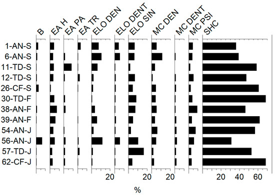 Relative abundances of main phytolith morphotypes obtained from cow dung samples with indication of sample number-farm-month. B = bulliform flabellate/blocky, EA H = Epidermal appendage hair, EA PA = Epidermal appendage papillate (papillae), EA TR = Epidermal appendage trichome (acute bulbosus), ELO DEN = Elongate dendritic, ELO DENT = Elongate dentate, ELO SIN = Elongate sinuate entire (psilate), MC DEN = Multicelled phytoliths of elongate dendritics (silica skeleton with dendritic/papillate/short cells/stomata), MC DENT = Multicellular structure of elongate dentates (silica skeleton with dentates/with papillate/short cells), MC PSI = Multicellular structure of elongate psilate (smooth), SHC= Short cell (rondel/trapeziform/bilobate).