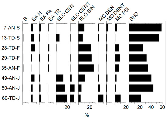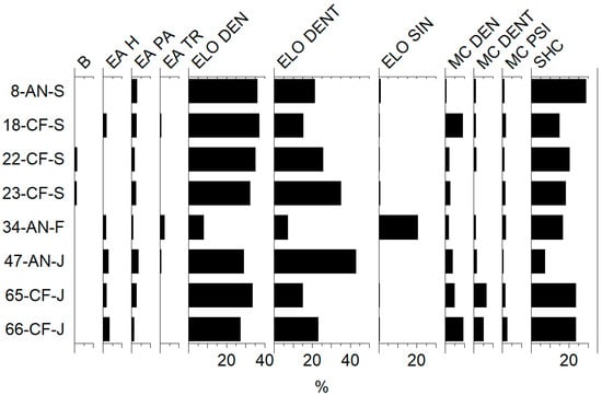 Overall, the morphological results indicated that most of the phytoliths derived from monocotyledonous plants and particularly grasses (around 90% of all the counted morphotypes, Table 4). The only exceptions were the sheep dung samples collected in winter from both farms, Algenderet Nou and Talatí de Dalt (samples coded as AN-F and TD-F, ca. 85%). This difference may be due again to the dietary regime of these flocks of herds, which graze in semi-freedom without any supplementary fodder. Interestingly, the same sheep dung samples have delivered the lowest ratios in terms of inflorescences/leaves and stems of grasses (Table 4). In contrast, animals with a diet based on cereal grains and flour from their own farms yielded the largest concentrations of phytoliths from the floral parts of cereal crops, barley in the case of pigs from Algenderet Nou (AN samples, ratios between 7.6–8.7) as well as from Es Capell de Ferro (CF samples, 6.2–6.6, Table 4 and Figure 7). Therefore, these markers characterized by relatively high proportions of diagnostic phytoliths from the floral parts of cereals within dung can be used as indicators of livestock supplementary fodder such as cereal grains and flours. An additional potential indicator for the use of crop flours as fodder would also be the index of multicellular or anatomically connected phytoliths, which is associated with the state of preservation produced by the mechanical degradation of multicelled morphologies during the grain cleaning and the grinding processes, as demonstrated through experimentally produced records on barley processing from Algenderet Nou [47], as previously argued. In summary, the modern dung reference standards obtained in the current study demonstrate that particularly the ratios of phytoliths produced by the inflorescences vs the leaves and stems of grasses, as well as ratios of individual (single-celled) vs anatomically connected (multicellular) phytoliths may serve as indicators of human manipulation in the feeding of livestock animals.