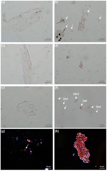 Photomicrographs of phytoliths and dung spherulites identified in the samples (200× or 400×). (a) multicelled (articulated) elongate psilate (smooth) phytoliths with short cell rondels and epidermal appendage acute bulbosus (trichomes) from the leaves of Pooideae grasses, sheep dung, sample 7-AN-S; (b) multicellular (articulated) dendritics with papillate, along with disarticulated dendritics (arrows) from grass inflorescences, pig dung, sample 18-CF-S; (c) multicellular (articulated) dendritics, cow dung, sample 6-AN-S; (d) epidermal appendage hair from dicotyledonous leaves, sheep dung, sample 29-TD-F; (e) epidermal appendage hair base from dicotyledonous leaves, cow dung, sample 6-AN-S; (f) spheroid echinate phytolith (sp) along with fragmented dendritics (de) and a short cell (shc), pig dung, sample 22-CF-S; (g) darkened dung spherulite at XPL, cow dung, sample 56-AN-J; (h) cluster of dung spherulites at XPL (none darkened), sheep dung, sample 29-TD-F.