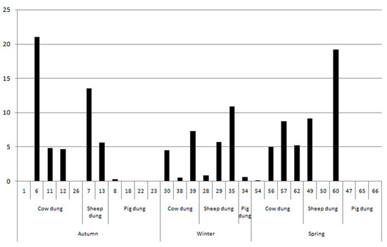 Plot showing average concentrations of dung spherulites obtained from dung samples.