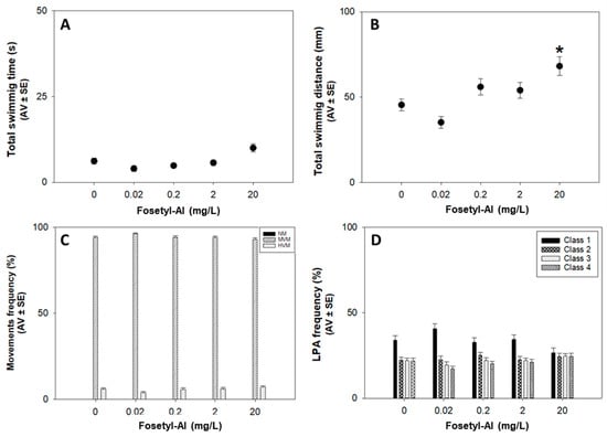 Effects of 120 h of exposure to fosetyl-Al on zebrafish larvae for total swimming time (A) and distance (B); types of movements (C); and larvae path angle (LPA) (D). NM, no movements; MVM, medium-velocity movements; HVM, high-velocity movements. Class 1: big amplitude angles (90–180°); Class 2: medium amplitude angles (30–90°); Class 3: medium amplitude angles (10–30°); Class 4: small amplitude angles (0–10°). Data are expressed as average value (AV) ± standard error (SE). * Significant differences to control (p < 0.05).