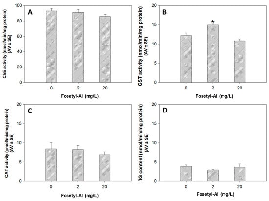 Effects of 96 h pf exposure to fosetyl-Al on zebrafish larvae for cholinesterase (ChE) (A); glutathione S-transferase (GST) (B); catalase (CAT) (C) activities; and total glutathione (TG) content (D). Data are expressed as average value (AV) ± standard error (SE). * Significant differences to control (p < 0.05).