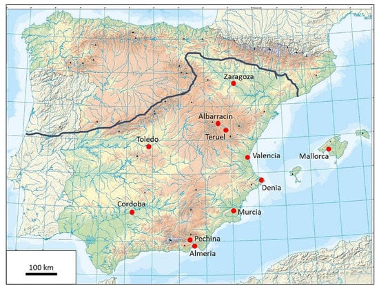 - Bosh Vilá, J. Albarracín musulmán. Historia de Albarracín y su Sierra; Instituto de Estudios Turolenses: Teruel, Spain, 1959; Volume 2. [Google Scholar]