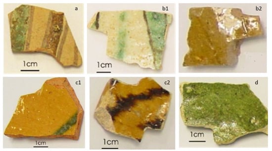 - Green glazes (Figure 2d): fragments decorated with green glazes included ceramics glazed on both sides, with the same green color in many cases, but some fragments had the main side colored in green and the secondary side of yellow color. Nineteen green glazed samples were selected.