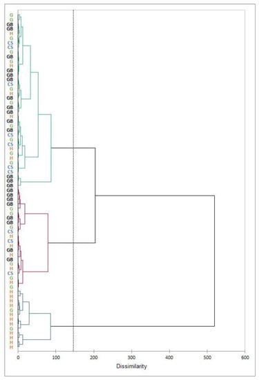 Dendrogram from hierarchical clustering analysis of the body composition data (CS: cuerda seca; GB: green and brown decoration on white glaze; G: green glaze; H: yellow/honey glaze).