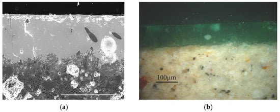Examinations by SEM of polished sections of cuerda-seca glazes confirmed the presence of abundant inclusions scattered homogeneously in the glaze (Figure 6). The inclusion sizes varied from 50 to 70 μm and their composition was mainly quartz. The use of such an amount of inclusions and their size, plus the tin-oxide content, could be responsible for the opacity. Opacification can be reached either with undissolved inclusions into the glazes or with tin-oxide crystals scattered in the glaze, and even with both of them [,]. Cuerda-seca ceramics manufactured in the same period in al-Andalus employed both techniques [,,], although only tin oxide was employed as an opacifier in later centuries. Therefore, the inclusions found in the glazes played an important role in the opacity of the glazes. The thickness of the glazes reached values higher than 200 μm and the thickness of the clay-glaze interfaces was also higher (>45 μm), which implied that a single firing technique was carried out during the pottery’s manufacture. The type of firing process (single or double) depended on the workshops; both techniques were used without a clear tendency. Single firing process was more frequent, especially in workshops such as Almeria and Zaragoza [,]. This characteristic was also followed in the studied production from Albarracin Taifa.