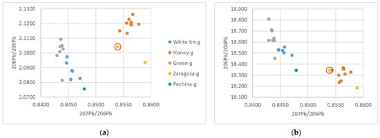 Lead-isotope ratios of glazes from different ceramics (white tin-opacified glazes, honey glazes, and green glazes from Albarracin; glazes from Zaragoza workshops (white tin-opacified glaze is marked with a red circle); and glaze in a sample from Pechina): (a) 208Pb/206Pb ratio vs. 207Pb/206Pb ratio; (b) 206Pb/204Pb ratio vs. 207Pb/206Pb ratio.