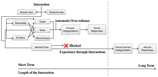 Three early theories attempted to understand the social response to virtual humans. Kiesler and Sproull [26] claimed that the social response was due to the novelty of the situation and would disappear once the person became knowledgeable about the interaction and technology. More elaborate models include the aforementioned computer-as-social-actors by Nass and his colleagues [13,14,15] and the threshold model of social influence by Blascovich et al. [27] (for a complete review see [28]). The essence of Nass’ claim is that people unconsciously respond socially to computers, which was supported with ample empirical data of participants’ categorical denial that they did not think there were programmers behind computers.