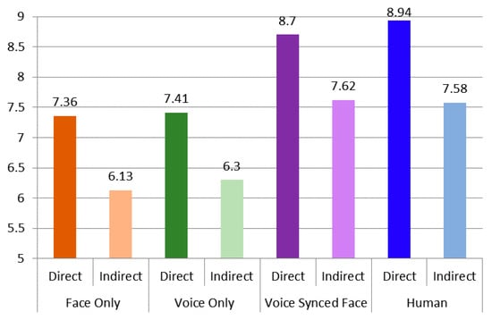 In the present context, of interest is whether people respond to virtual humans as if virtual humans have a personality. A number of studies suggest that there are at least three factors that play a role in the social interaction with virtual humans involving personality, including characteristics of language [64,66], character appearance [67], and character behavior [15,68]. The human’s personality also plays a role [69]. Specifically, the research showed that if the personalities are similar between the human and the virtual human, the human recognizes the virtual human’s personality better than when the personalities are dissimilar.