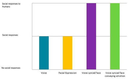 While some studies [42,43] investigated the effect of voice exclusively, other studies investigated characteristics such ass emotion or personality manifested in voice [44,45]. In experiments with a voice embodied in a virtual human, the social rule was observable or the virtual humans were as effective as humans in engendering a social phenomenon. Voice is probably the most studied human-like characteristics of virtual humans that produce social responses of consistency-attraction [44], emotional consistency [45], gender stereotype [16,46], notion of “self” and “other” [16], persuasiveness [34,42,43], politeness norm [14,16], and similarity attraction [44].