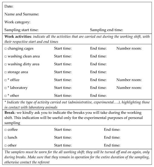 All workers were informed of the aim of the study and their participation was voluntary. After the sampling, information about qualifications and working tasks performed during the working shift were collected on a work record sheet. Any breaks at work were also recorded (Figure 1).