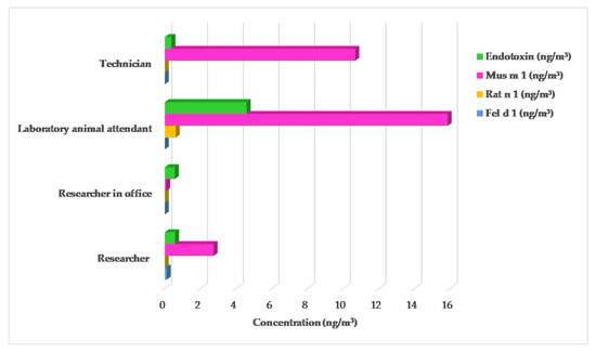 As it can be appreciated by Table 1, the laboratory animal attendants are largely more exposed to endotoxins and allergens than the other categories. Furthermore, technicians have higher levels of mouse allergens than researchers. This fact can be visually evaluated by looking at Figure 2. Fel d 1 was detected in three researchers (average concentration: 0.11 ng/m3).