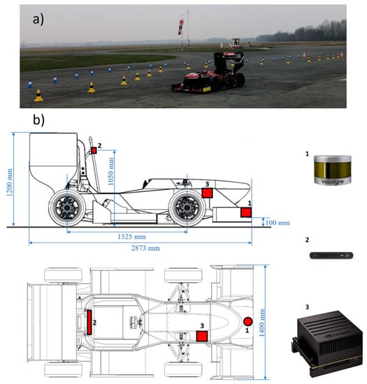 The vehicle senses the surrounding environment featuring a custom perception pipeline composed of a LiDAR-based sensor with an integrated high-performance Graphic Processing Unit (GPU) and a stereocamera. The former sensor is mounted in the middle of the front wing of the vehicle at a height of about 0.1 m from the ground. The latter instead is placed on the main roll hoop, above the driver’s seat. Both the sensors are interfaced with a properly designed Robotic Operating System (ROS) environment that can handle the measurements during vehicle’s motion and fuse them in order to provide real-time estimation about the position and type of surrounding obstacles. Specifically, the racing environment is structured with multiple traffic cones of different colors, as illustrated in Figure 1.