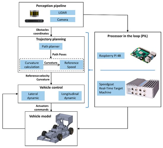 This section describes the design method of the proposed PIL architecture. First, starting from the perception pipeline installed on-board the racing vehicle, the retained software layout is defined. In detail, the proposed software layout assesses the motion planning task and control of the vehicle command inputs. Subsequently, the hardware setup and the connection specifications between the considered real-time target machines and the host personal computer are illustrated. Last, technical details of the considered computing platforms are highlighted with the objective of defining the PIL layout implications of both architectures.
