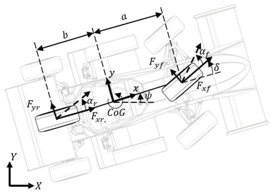 This section describes the released vehicle and tire models that are used for trajectory planning algorithm test and validation purposes. Several mathematical models have been investigated in the recent literature with different levels of complexity and accuracy based on the research context []. In this paper, the vehicle is modeled using the 3-DOF rigid vehicle model (single track) for both lateral and longitudinal dynamics as depicted in Figure 3.