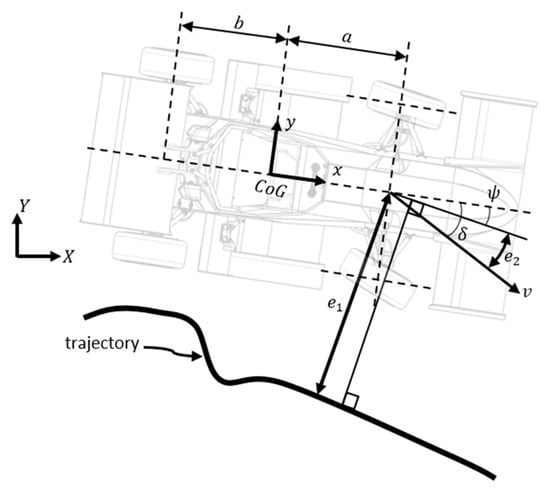In case of forward driving motion and steering system acting only on vehicle front guiding wheels, the derivative of the cross-track error and relative yaw angle can be defined as follows: