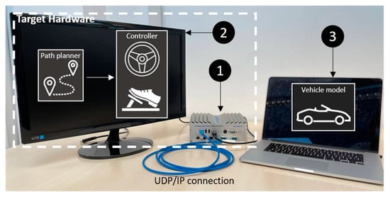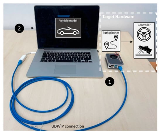 In this work, MIL contains all the subsystems (perception, motion planning, and control, and vehicle model) needed to perform the simulation. Conversely, the retained PIL setup splits these components into two groups: a first set running on the target computer with a compiled application, containing the motion planning and control, and another set, i.e., the vehicle model only, running on the host PC. The command input for the vehicle model plant on the host PC, i.e., the steering angle at the wheels and the acceleration command, are sent via UDP, along with the fed-back information of the vehicle state running on the real-time target machine. UDP is a packet-based protocol that uses an Ethernet board as physical layer. This protocol is advantageous for real-time application because has smaller delay than TCP connection as it does not retransmit lost packets. To this extent, UDP Send and Receive blocks are set in the MATLAB/Simulink environment to interface with the motion planner and controller (target side), as well as the vehicle plant model (host side). Furthermore, simulation pacing option is set to obtain near-real-time simulation also on model running on development computer, thus forcing the synchronization between the plant model running on the development computer and the controller flashed onto the target device. The setup of the PIL test using the Speedgoat Real Time target machine is shown in Figure 6, while the PIL test setup exploiting the functionality of Raspberry Pi 4B board is represented in Figure 7.