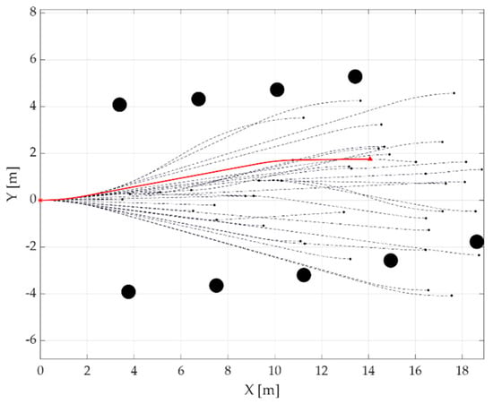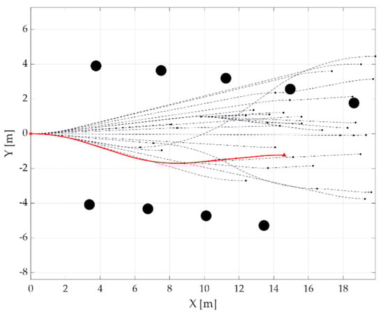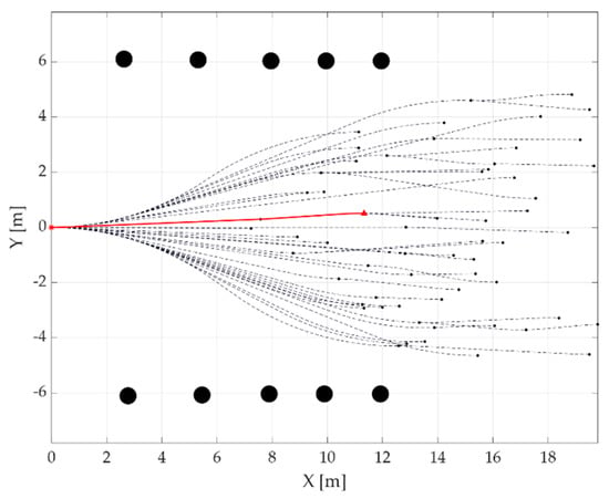 In Figure 8, Figure 9 and Figure 10, the planned trajectory is represented by a red solid line, while the search tree is represented by a dashed black line. The initial vehicle position is labeled with a red asterisk and the goal position is indicated by a red triangle. The detected cones are represented with black dots. In the first maneuver, the self-driving vehicle travels a straight road portion with a reference longitudinal speed of 22.2 , while in the second and third one the autonomous racing vehicle travels a left/right constant radius turn of 50 with a reference longitudinal speed set at 13.8 .