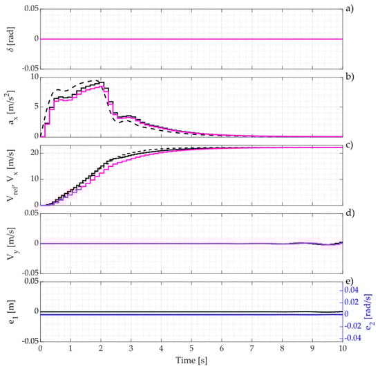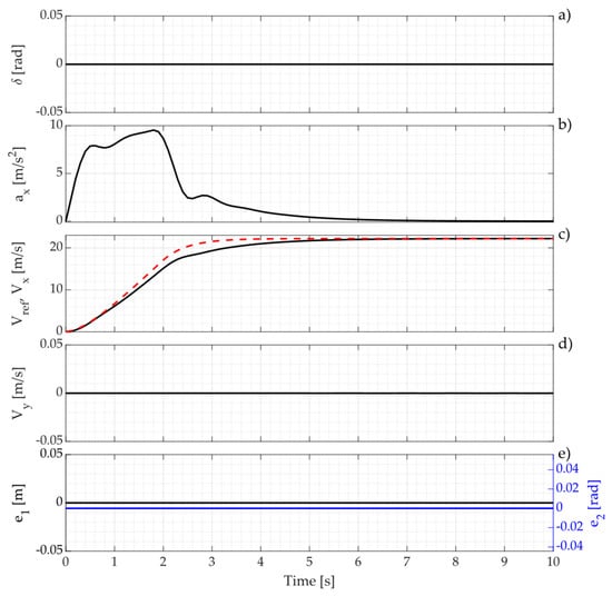 Results obtained for the straight road portion in MIL configuration (see Figure 8). Measured vehicle states: (a) Front wheels steering angle ; (b) Longitudinal acceleration ; (c) Longitudinal speed reference (red, dashed) vs. Actual longitudinal speed (black, solid); (d) Lateral speed (e) Cross track (black, solid) and Relative yaw angle (blue, solid).