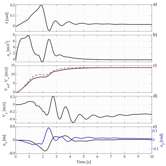 Results obtained during the right turn maneuver in MIL configuration (see Figure 10). Measured vehicle states: (a) Front wheels steering angle ; (b) Longitudinal acceleration ; (c) Longitudinal speed reference (red, dashed) vs. Actual longitudinal speed (black, solid); (d) Lateral speed (e) Cross track (black, solid) and Relative yaw angle (blue, solid).