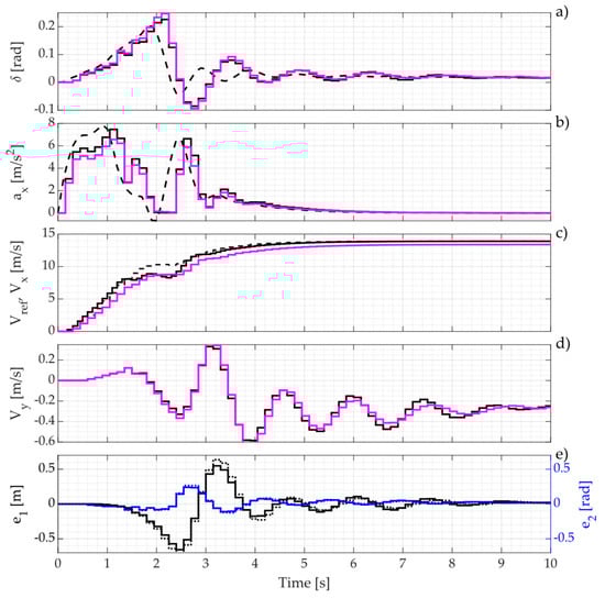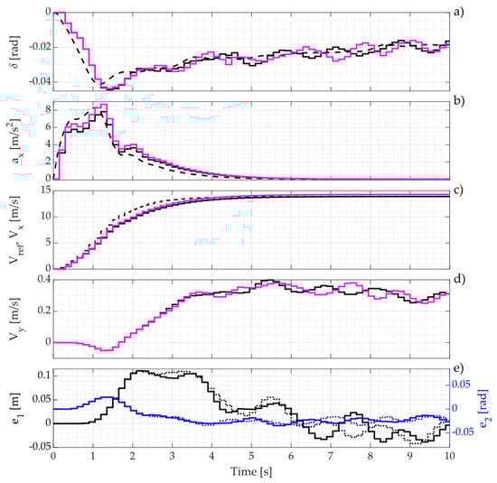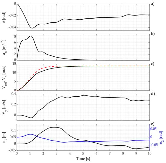 Results obtained during the left turn maneuver in MIL configuration (see Figure 9). Measured vehicle states: (a) Front wheels steering angle ; (b) Longitudinal acceleration ; (c) Longitudinal speed reference (red, dashed) vs. Actual longitudinal speed (black, solid); (d) Lateral speed (e) Cross track (black, solid) and Relative yaw angle (blue, solid).