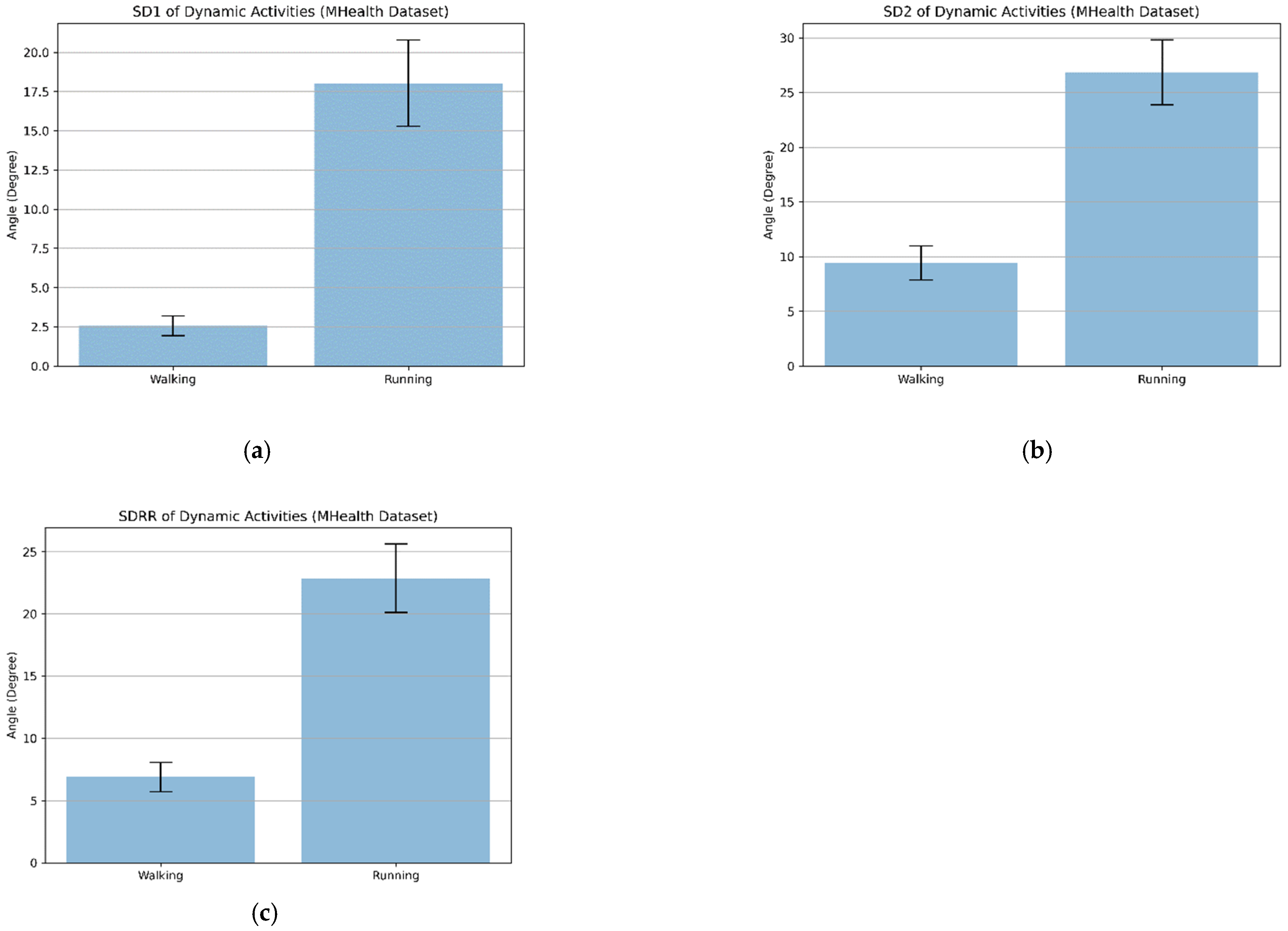 (a–c) Bar plot of SD1, SD2, and SDRR, respectively, of dynamic activities (walking and running) with the MHealth dataset.