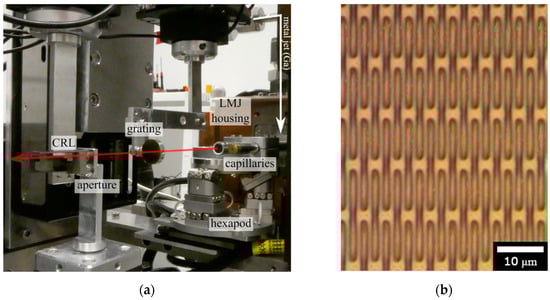 (a) Liquid MetalJet (LMJ) setup at the LRM in Würzburg. In the upper right corner, the position of the metal jet is indicated by a white arrow. The Be exit window in the LMJ copper housing is hidden by two capillaries mounted on a hexapod. The left capillary is a polycapillary, used for illuminating an absorption grating (sample). For imaging the grating, an aperture (50 µm × 50 µm) is placed as near as possible to the grating. (b) Light microscopy image of the absorption grating (period 2.4 µm, 10 µm gold thick-ness, microworks GmbH) used as sample. The small differences in contrast originate from the light microscope illumination, not from the absorption grating.