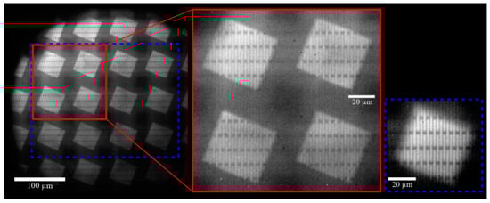 The multiple images of the grating are shown in Figure 4. The exposure time was 400 s. The images are dark-field and flat-field corrected with the use of a background image taken with no sample in the beam. The areas outside the illumination cone of the poly-capillary are black. Inside of the tilted 50 µm × 50 µm aperture, gold lamellas are shown in gray (magnified section in Figure 4, middle). It can be seen by the different vertical position of horizontally oriented structures that the FoV is slightly different for each CRL. This deviation could be overcome by a more exact alignment of the distance between sample and multi-focus CRL, leading to a larger effective FoV. The number of images on the detector here is limited by the diameter of the illumination cone of the polycapillary. The detector size would have allowed all 9 × 9 images of the multi-focus CRL to be taken. Each of the 9 × 9 sub-images of the sample is generated by a different single sub-CRL of the multi-CRL array.