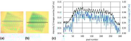 Comparing the intensities (c) of one of the twelve images in Figure 4 ((a) blue line, right axis) with the overlay of the twelve images ((b) black line, left axis).
