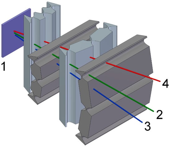Between the individual images of the field of view, the background should be dark or show some stray light, because the FoV was stopped down. In the real measurements, however, clear structures can be seen between the individual images of the FoV. To understand these structures, beam tracking simulations were performed with the commercial software OpticStudio (Zemax LLC, Kirkland, WA, USA). The measurement setup was simulated true to scale taking into account the aperture, the grating as a sample, and the illumination with the polycapillary. The results are shown in Figure 6. There is an excellent agreement with the measured data. By tracing the path of individual rays through the multi-focus CRL, the origin of the structured background could be clarified. The background is caused by rays that have partially or completely passed through the lens material in between the individual CRLs on their way through the multi-focus CRL (Figure 7). Since the sample illumination is also at wide angles, some rays only partially pass through a CRL and therefore do not contribute to the desired image. The structures in the background are caused by the fact that there are rays that have passed through a significantly different number of vertical or horizontal single lens elements. Such rays provide an image of the sample that appears distorted in one direction in space, similar to imaging with an astigmatic lens. The structured background disappears when an absorbing wall with windows for each CRL is placed in front of and behind the multi-focus CRL in the simulation. In this case, all rays that have not passed through the optics correctly are blocked out.