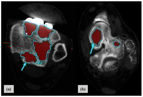 Segmentation of osteolysis in the distal tibia (a) and talus (b) based on 3D-CT reconstruction (red and blue indicate osteolysis and the sclerotic border of osteolysis, respectively).