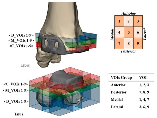 To determine the extent and location of osteolysis in the distal tibia and talus, nine regions were defined on each CT image, all of which included periprosthetic bone. The spikes of the metal tibial component and metal talar pegs served as landmarks. After 3D reconstruction of the ankle joints, 54 volumes of interest (VOIs; 1893.3 ± 1343.1 mm3) were generated, 27 in the distal tibia and 27 in the talus (Figure 3). VOIs were grouped according to anatomical direction: superior–inferior (closest peripheral (C_VOI), mid-peripheral (M_VOI), distant peripheral (D_VOI)), anterior (VOI 1–3)–posterior (VOI 7–9), and medial (VOI 1, 4, 7)–lateral (VOI 3, 6, 9). Particularly in the talus, VOIs that included peg of talar component (VOI 4–6) were grouped and compared with the other VOIs (VOI 1–3, 7–9). The location, distribution, and volume of osteolysis within each VOI were measured, and the volume was normalized by reference to the size of the ankle joint of each patient.
