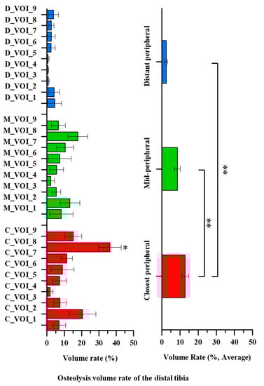 The average distal tibial osteolysis volume of 12 patients. Significant differences are indicated by double asterisks (one-way ANOVA followed by Fisher’s LSD test, p < 0.05). Single asterisks indicate a significant difference compared to the center region (C_VOI_5, M_VOI_5 or D_VOI_5) (p < 0.05).