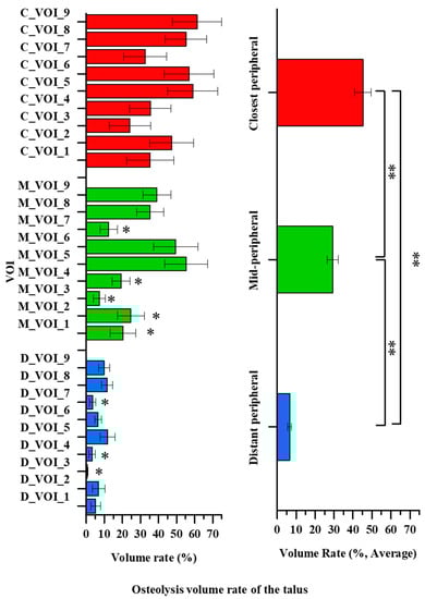 The average talus osteolysis volume of the 12 patients. Significant differences are indicated by double asterisks (one-way ANOVA followed by Fisher’s LSD test, p < 0.05). Single asterisks indicate a significant difference compared to the center region (C_VOI_5, M_VOI_5 or D_VOI_5) (p < 0.05).