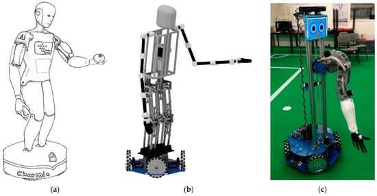 CHARMIE (Collaborative Healthcare/Home Assistant Robot by Minho Industrial Electronics) different variations. (a) Conceptual sketch of the anthropomorphic robot. (b) Developed anthropomorphic design. (c) Primary prototype assembled.