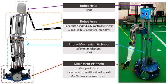 To perform the wide variety of non-standardised chores, CHARMIE’s system and hardware went through different development choices regarding hardware components and related dependencies. The complexity required by some tasks dictated that the robot’s system and hardware solutions had to contemplate a significant number of degrees of movement. From the omnidirectional platform to the arms, all components were dimensioned, envisioning the complex movements the robot must make. An example is pushing wheeled trolleys that force the robot to adjust the position of both arms throughout the action and the platform movement that must fit the moving object. Additionally, the anthropomorphic shape of CHARMIE allows users to be more receptive to interact with the robot, as described in []. From a practical perspective, it is easier to interact with the real world if the robot has the same shape as a human since the environment is optimised for human-shape interaction. From a social perspective, creating a small human’s physical appearance gives the impression users are interacting with a small, friendly robot, which translates into a sense of friendliness and proximity to its users. Even though, at the moment, CHARMIE is not fully anthropomorphic, some parts are, such the arm. The final objective is to reach the anthropomorphic level presented in Figure 1a,b.