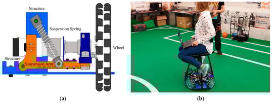 (a) MacPherson suspension system designed for CHARMIE to improve stability and guarantee all four wheels are in contact with the floor surface. Image from []. (b) CHARMIE’s motion platform load transportation experimental test. The platform was tested, moving for approximately 5 min while maintaining the movement performance and stability. The load in the picture shows an average adult human weight of approximately 65 kg.
